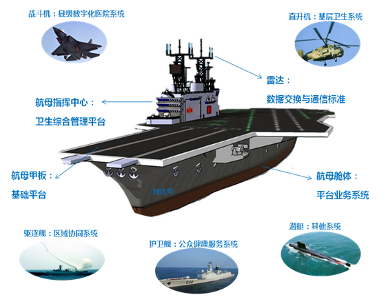 航母护卫舰:对应公众健康服务系统,体现为居民健康门户、健康管理信息平台等产品;